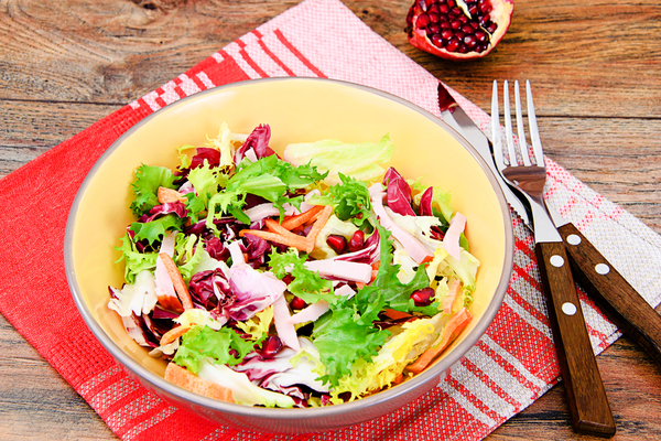 На блюдо выкладываем листья салата, мясо, грибы, лук. Заправляем соусом. Перемешиваем. Готовый салат посыпаем орехами и зернами граната.
