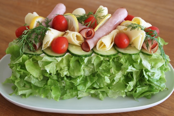 Затем бока торта промазываем оставшимся кремом или майонезом. Украшаем торт измельченной зеленью, помидорами, кружочками огурца и лимона, а также трубочками из ветчины.