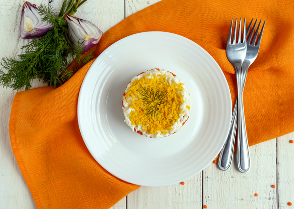 Выкладываем салат слоями, каждый промазывая майонезом: свекла, картофель, жареный лук, морковь и снова жареный лук. Затем выкладываем слои свекла, жареный лук. Последний слой посыпаем измельченным желтком.