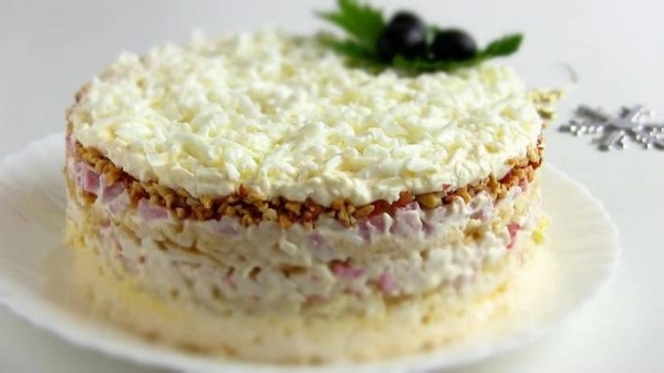 - Выложить салат слоями. Можно воспользоваться разъемной формой для выпечки, чтобы салат хорошо держал форму.