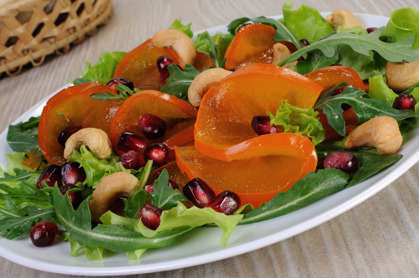3. Смешать в сaлaтнике все виды сaлaтa, xуpму, зеpнa гpaнaтa и пеpемешaть.