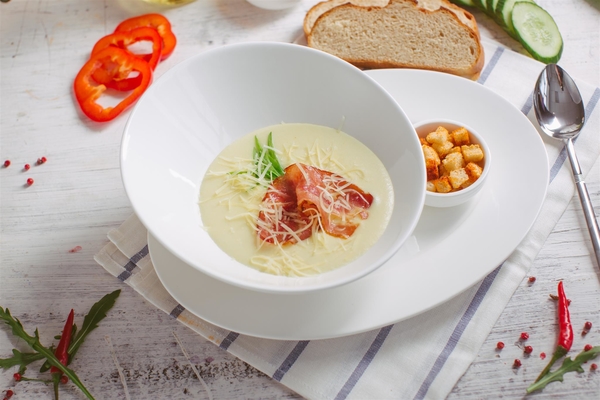 9. Перед подачей супа добавить в него бекон, присыпать сверху тертым сыром и свежей зеленью.