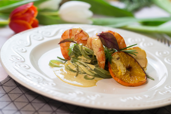 - Выложить горячую пасту в перемешку с креветками. Полить соусом. Подать с долькой жареного мандарина.