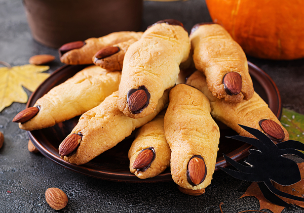 Тесто выкладывается на противень в форме, которая впоследствии будет напоминать человеческие пальцы. “Изюминкой” десерта станут черные ногти, которые получаются благодаря растопленному шоколаду и дольке миндаля, положенной сверху.