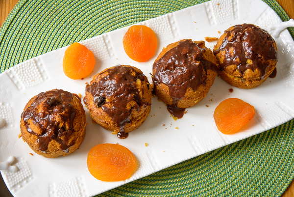 “Изюминка“ выпечки - курага. Целый сухофрукт будет находится в середине каждого кекса. Для красоты готовый кекс с курагой поливают шоколадом либо можно использовать абрикосовый конфитюр.