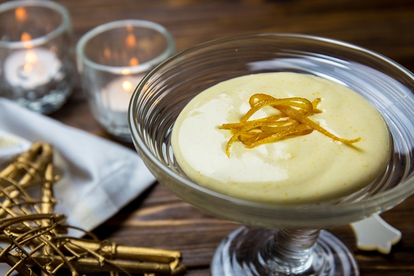 - Выкладываем сабайон в широкие бокалы, украшаем цедрой апельсина.