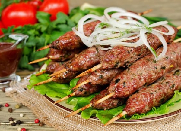 Предлагаем приготовить настоящий люля-кебаб по-узбекски: из баранины с курдючным салом. Подавать кебабы принято с зеленью, кольцами свежего лука, красным и чесночным соусом.