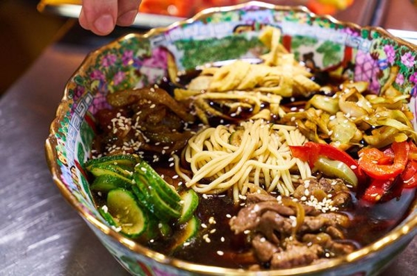 - Собрать куксу: на дно тарелки выложить лапшу, далее мясо, потом капуста и огурцы.
