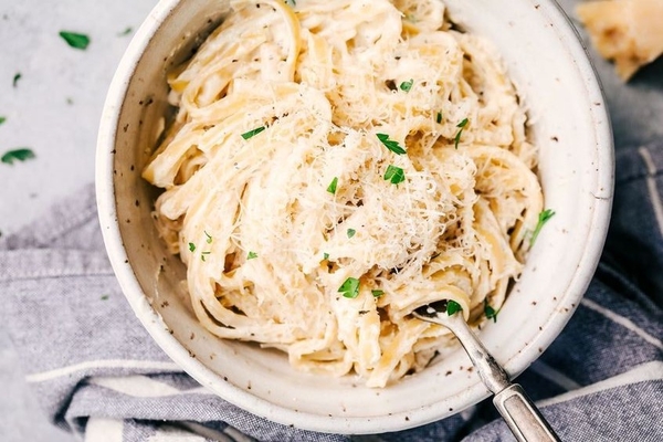 Сегодня мало кто знает, что этот соус к макаронам придумал один влюбленный итальянец-ресторатор. У него родился сын, но сразу же после родов у супруги испортился аппетит, и женщина отказывалась от еды вовсе. Чтобы спасти любимую, он придумал блюдо, от которого его жена не смогла отказаться. Это была паста с соусом из сливочного масла и тертого сыра. При этом сыр был взят из самой середины сырной головы, где он особенно нежный. Супруге так понравилось творение супруга, что она просила добавки. Потом блюдо приготовили посетителям и все они были в восторге от него. В Америку блюдо попало благодаря эмигрантам из Италии. Сегодня в пасту Альфредо добавляют также грибы, курицу, морепродукты и много других ингредиентов.