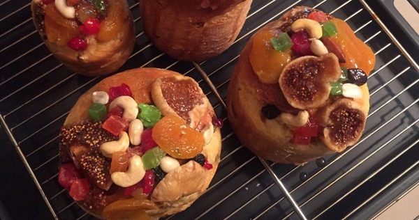 5. После второй расстойки тесто обмять и добавить сухофрукты, тщательно вмешивая их в тесто. Готовое тесто на присыпанном мукой столе разделить на части (4-5) и разложить по формам, накрыть полотенцем и поставить подходить, пока не поднимутся.
