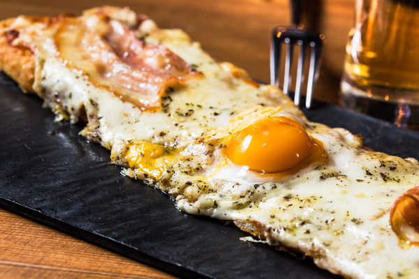 - Выложить лепешку на противень, посыпать оставшимся беконом.