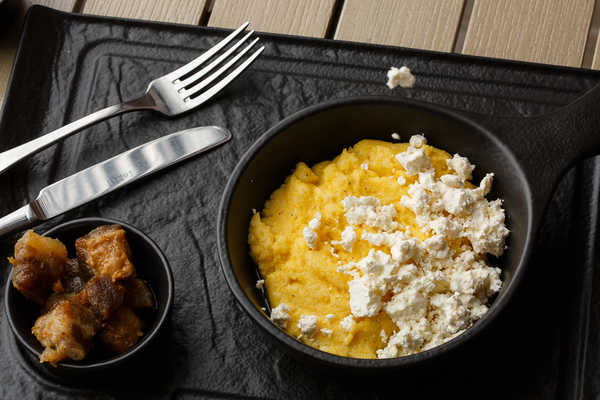 - Выложить бануш на тарелку, сверху посыпать беконом и брынзой.