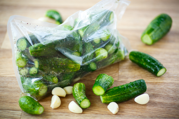 Чтобы засолить огурцы, необходимо приготовить засолочную массу из соли, сахара, чеснока и укропа. Ею посыпают помещенные в пакет огурцы и встряхивают. Засаливание должно проходить в холодном месте.