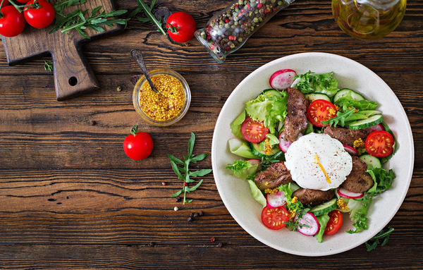 Салатом с вареным яйцом сегодня никого не удивить. Это - безусловно вкусный, но давно привычный ингредиент для повседневных блюд, поэтому его часто используют для большей сытности и практически на автомате. Совсем другое дело - яйцо пашот. Тонкий вкус и необычный вид сделают самую простую подачу и самый обычный овощной салат праздником. Ivona делится с вами рецептом необычного салата с яйцом пашот и пикантной куриной печенью.