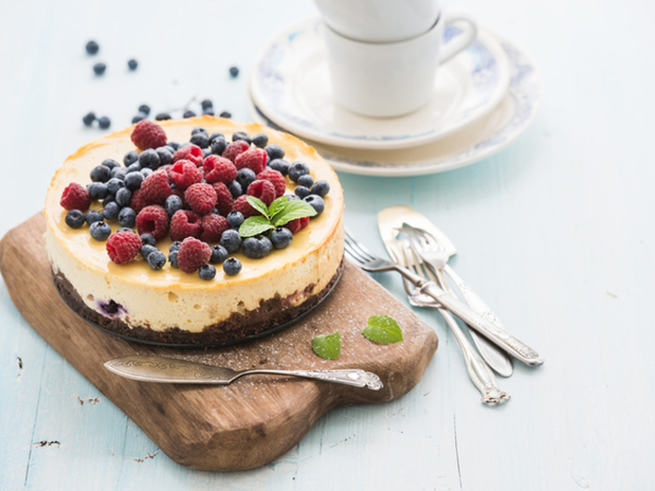 Когда чизкейк застынет, форму следует на пару секунд окунуть в горячую воду, чтобы торт легко вынимался. Перевернуть форму на тарелку, форму снять, а чизкейк можно украсить по желанию кусочками фруктов, какаю или ганашем.