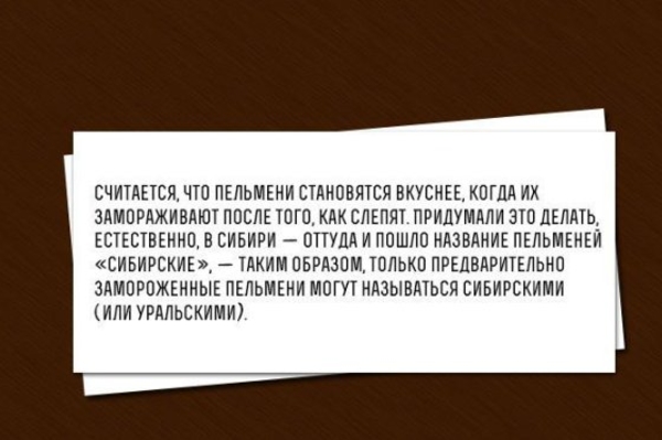 Пельмени – это популярное блюдо из мясного фарша, обернутого тестом и сваренного в кипящей воде. Россияне считают пельмени своим национальным блюдом. Но по технологии приготовления оно не свойственно для славянских кухонь: долгая подготовка и быстрое приготовление не совсем вписываются в кулинарные традиции народов, у которых еда томится в печи как минимум полдня. Пельмени прижились благодаря охотникам: замороженные пельмени они брали с собой в дальние походы.