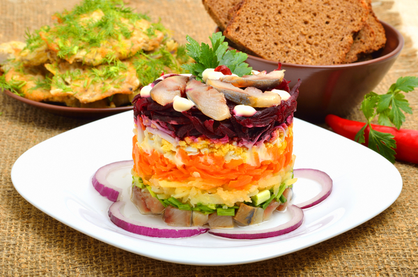 Знаменитая селедка под шубой, приготовленная в виде желейного торта, удивит гостей своей необычной подачей.