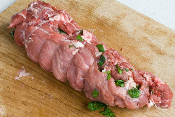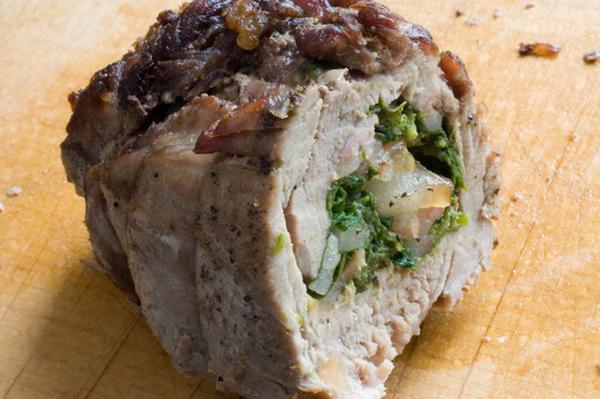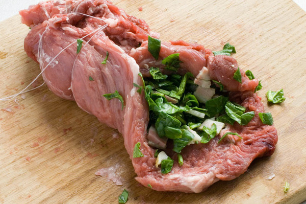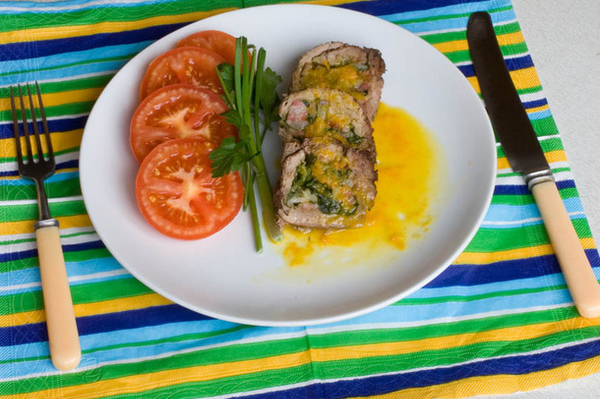 Нежное филе, свернутое рулетом. А внутри притаилась шпинатная начинка. Сюрприз!