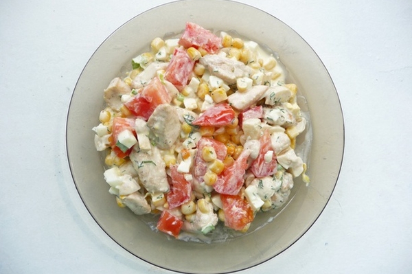 Салат с поджаренной курицей, шампиньонами и кукурузой.