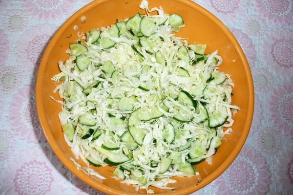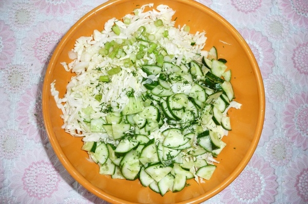 Летний салат из капусты и огурцов.