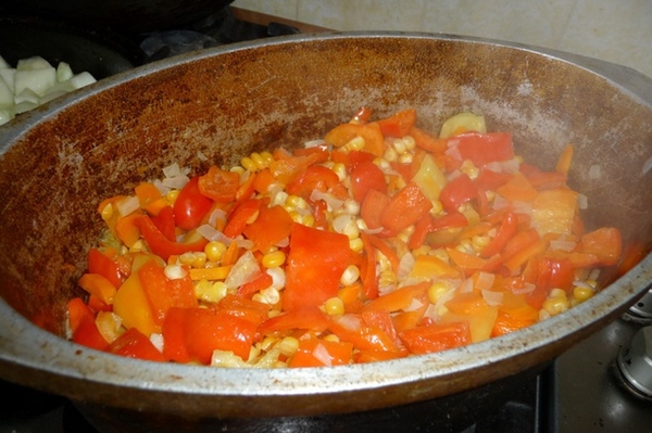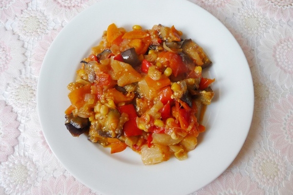 Рагу из помидоров, баклажанов, патиссонов и красного перца с кукурузой