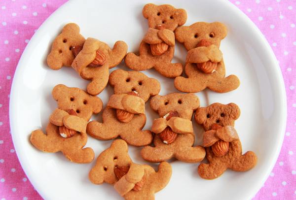 Вырезать фигурки мишек с помощью формочек для печенья. Карандашом сделать отверстия в виде глазок и носика. Поместить сверху на животик миндальный орех, затем крепко обнять его лапками медвежонка. Использовать оставшиеся тесто, чтобы сделать хвостики.