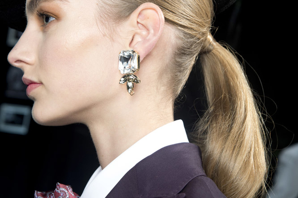 Образы на показе DSquared2 были одновременно мужественные и женственные. Прически, вдохновленные гламурной ночной жизнью 1940-х, идеально сочетались с английскими костюмами и нарядными платьями. Коллекция являла собой невероятный микс роскошных воротников из перьев марабу, переливающихся тканей и нарядных аксессуаров, напоминающих об эпохе гангстеров. “Мы хотели создать прическу, которая бы соединила в себе мужественность и женственность, показанные в коллекции одежды. Мы взбили волосы в шикарные конские хвосты и зачесали их по-мужски на боковой пробор”, – объясняет Сэм.