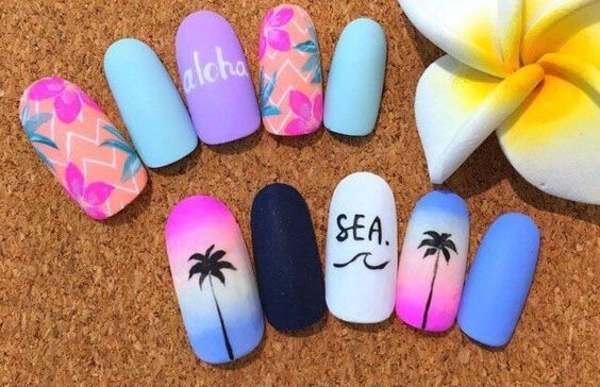 Классический синий – самый модный цвет года, но вы можете использовать любые его оттенки, создавая на ногтях омбре или градиент. Если вы – поклонница стиля Барби, сделайте красивый пляжный маникюр в розовых тонах. Ракушки, жемчужины, морские звезды, изображения пальм, тропиков, фруктов - все варианты дизайна будут выглядеть максимально уместно, когда Вы отправитесь на отдых.