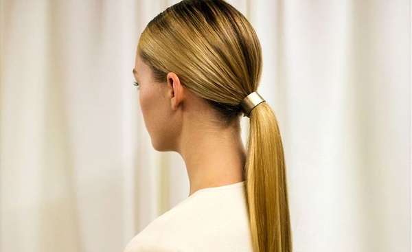 Чтобы сделать такой элегантный хвост, волосы должны быть идеально прямыми. Перед укладкой нанесите на них выпрямляющее средство и воспользуйтесь утюжком. Отделите сверху большую прядь волос и зафиксируйте её заколкой. Сзади заплетите хвост. Оставшимися незаплетёнными волосами крест-накрест закройте резинку.