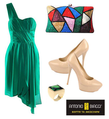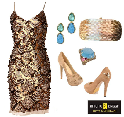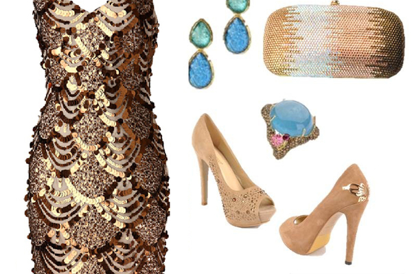 Золотые реки, лазурные берега. Роскошный образ в стиле королевских вечеринок очень просто создать с помощью сияющих аксессуаров в золотых тонах. Усыпанные стразами туфли цвета розового золота французский пальчик и блестящий клатч дополните украшениями в голубых тонах.