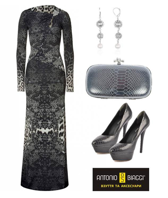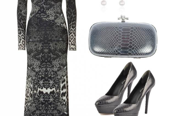 Змеиный блеск. Пришло время для смелого total look! Повторив тему рептилий в наряде, обуви и аксессуарах, оденьте ультрасовременное макси серебристых тонов. Усильте эффект наряда классическими лодочками со змеиным принтом и таким же гладким клатчем.
