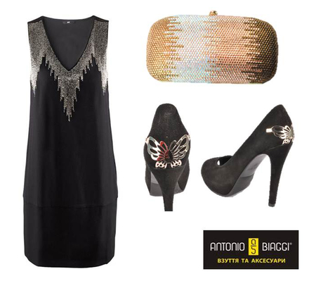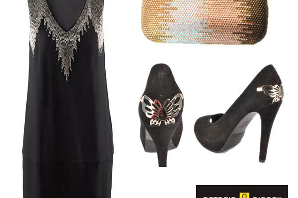 Стильная классика. Черный и золото – классическое сочетание, завоевавшее популярность в Париже 20-х годов. Блистая в свете фейерверков в новогоднюю ночь, вы будете неотразимы в платье с золотой аппликацией, дополненном сияющим золотистым клатчем и сексапильных туфлях на высоком каблуке, декорированным романтическими бабочками.