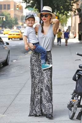Папарацци сфотографировали Миранду с сыном Флинном во время прогулки. Миранда умело соединила в своем образе комфорт с модными трендами сезона. Серую трикотажную майку модель надела с макси-юбкой с леопардовым принтом. Она дополнила образ шляпой-федорой и темными очками.