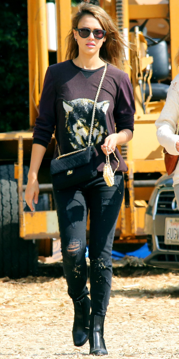 Даже для семейного похода за декоративными элементами для Хэллоуина Джессика Альба была одета очень стильно. Свитер от Charles Henry с анималистичным принтом в виде морды волка, рванные джинсы и грубые ботинки создали простой, но гармоничный образ.