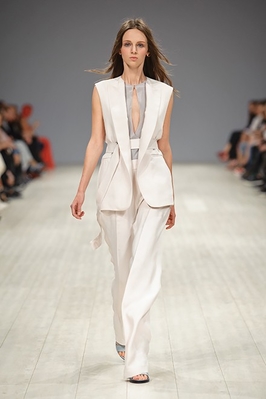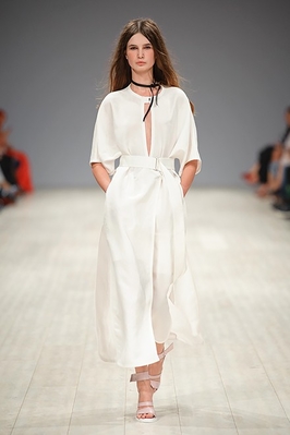 Основой новой линейки Елены Бурениной стали простые, но при этом очень выигрышные силуэты: юбки-миди, удлиненные жакеты без рукавов, штаны-клеш и платья на тонких брительках. Объединающей деталью всех образов стали непропорциональные тонкие полоски лент, которые обвивали шеи, талии и запястья моделей.