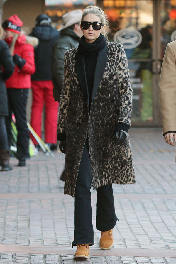 На днях белокурая красотка была замечена на одной из улиц Аспена (США). Для прогулки модель выбрала стильный ансамбль из черного вязаного свитера, штанов-клеш и пальто с леопардовым принтом.