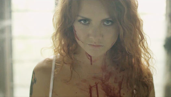 В самом конце ролика певица Максим появляется в изрезанном свадебном платье (в своем собственном) вся в крови и со злобным взглядом: