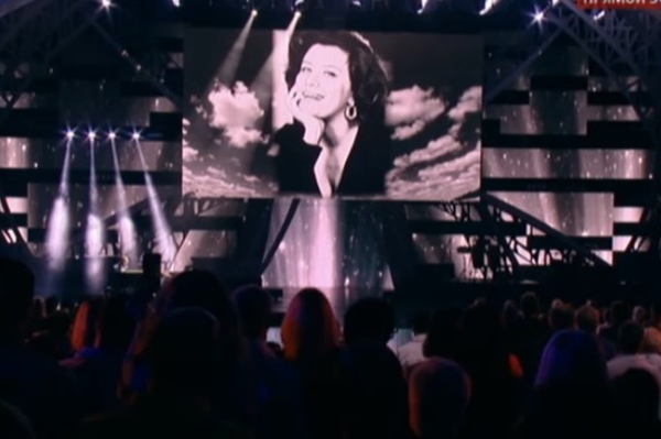 На экране сцены крутились фотографии покойных певицы Жанны Фриске, исполнителя Батырхана Шукенова (А-Студио), балерины Майи Плисецкой и певицы и актрисы Елены Образцовой.