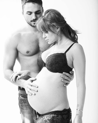 На черно-белых фотографиях Слава изображена в бюстгальтере и с оголенным беременным животиком, а Эдгар ее нежно обнимает.