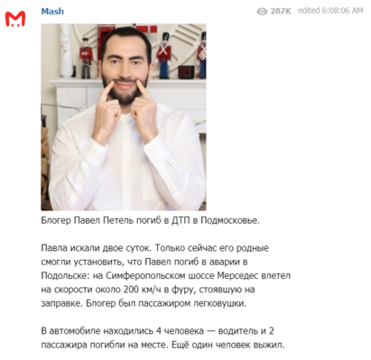 Авария случилась еще 4 апреля. Однако только спустя 2 дня удалось установить личности погибших. На Симферопольском шоссе автомобиль, в котором находился Павел на скорости около 200 км/ч врезался в фуру, стоявшую на заправке.