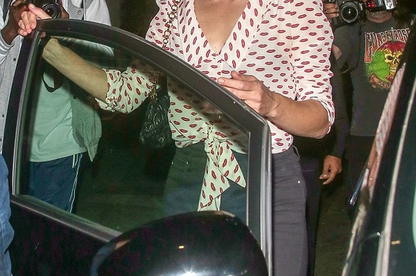 Звезда фильма Пятый элемент была одета в обтягивающие джинсы с высокой талией и белую рубашку с принтом в виде красных отпечатков помады.