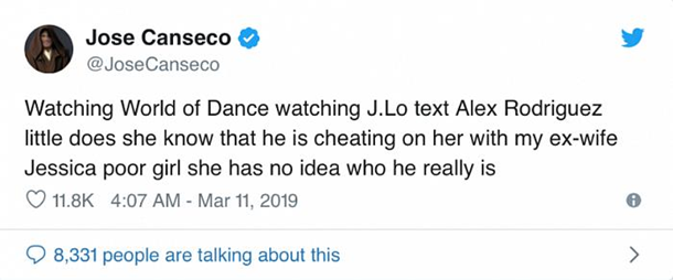 Коллега бейсболиста Алекса Родригеса Хосе Кансеко заявил в Twitter, что спортсмен изменяет своей невесте Дженнифер Лопес.