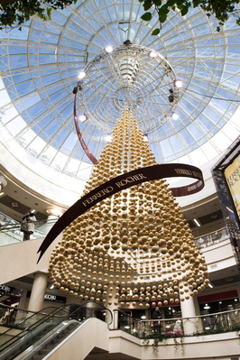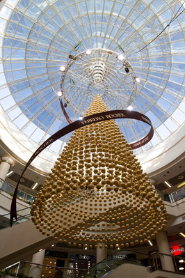 Эта удивительная сверкающая конструкция состоит почти из 2000 золотых шаров, на ее создание было потрачено 4 километра лески для крепежа шаров и почти 2500 метров золотой фольги! Высота инсталляции – 10 метров, а ширина – 5 метров! Все, кто до 20 января 2013 года посетят ТЦ Глобус, смогут увидеть не только огромную золотую подвесную елку от Ferrero Rocher, но и Парад звездных елок – экспозицию эксклюзивных тематических новогодних елок, созданных в канун праздников украинскими звездами, которые специально собрались на открытие необычной инсталляции.