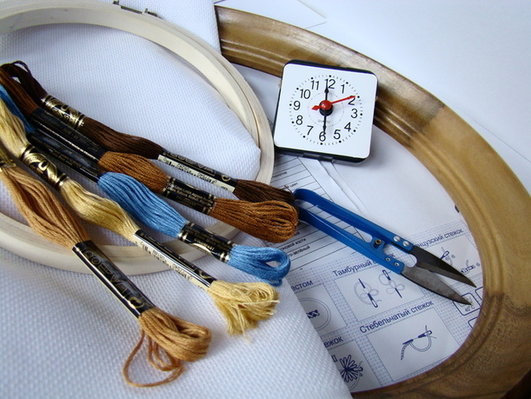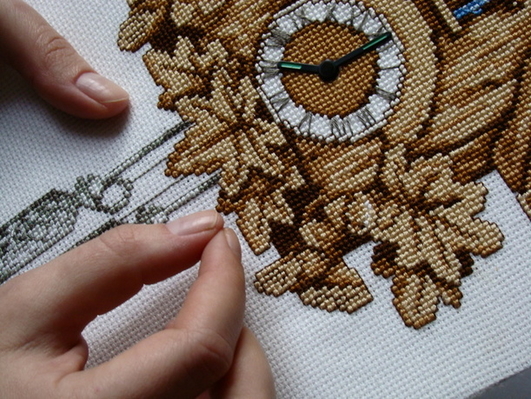 Стильные часы с вышивкой станут прекрасным дополнением к интерьеру загородного дома или дачи.