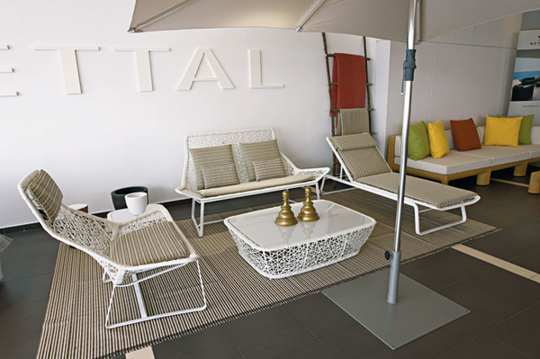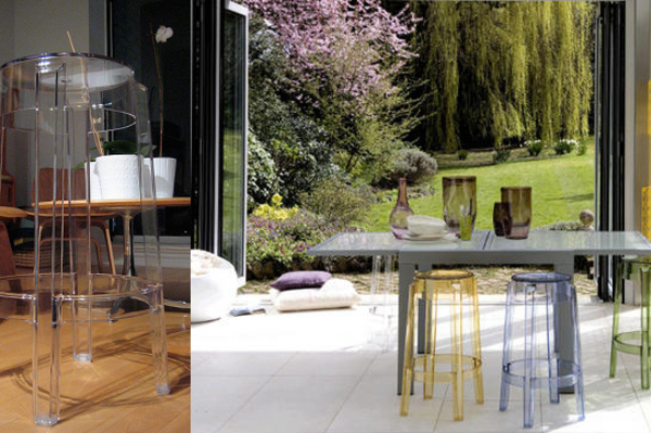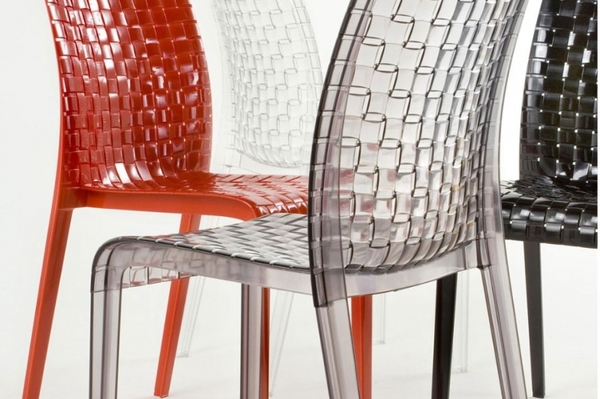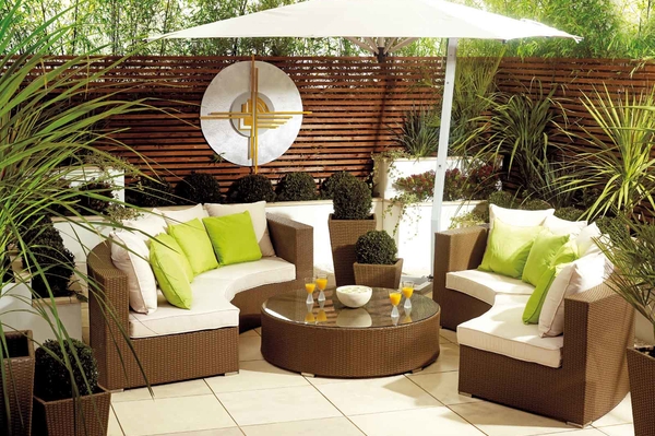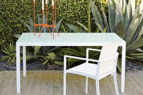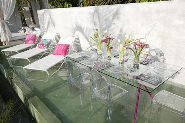 Стеклянная мебель не приживается в саду по причине своей хрупкости. Ее вытесняет прозрачная пластиковая мебель. Однако по-прежнему незаменимы столешницы из закаленного стекла для кованых и плетеных столов, стеклянные плиты на кофейных столиках из ротанга или из дерева, защищающие натуральные материалы от излишней влаги.