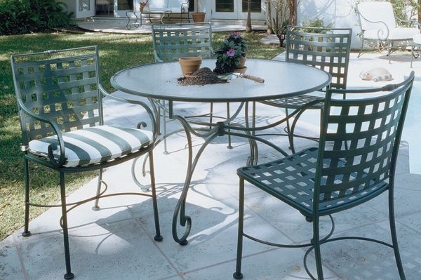 Кованая мебель – также традиционный вариант, смотрится очень изящно, идеально подходит для усадеб в классическом стиле. Из недостатков только один – стулья тяжелые. Впрочем, это компенсируется их исключительной прочностью. К тому же их не сдует внезапным порывом ветра, в отличие от легких пластиковых.