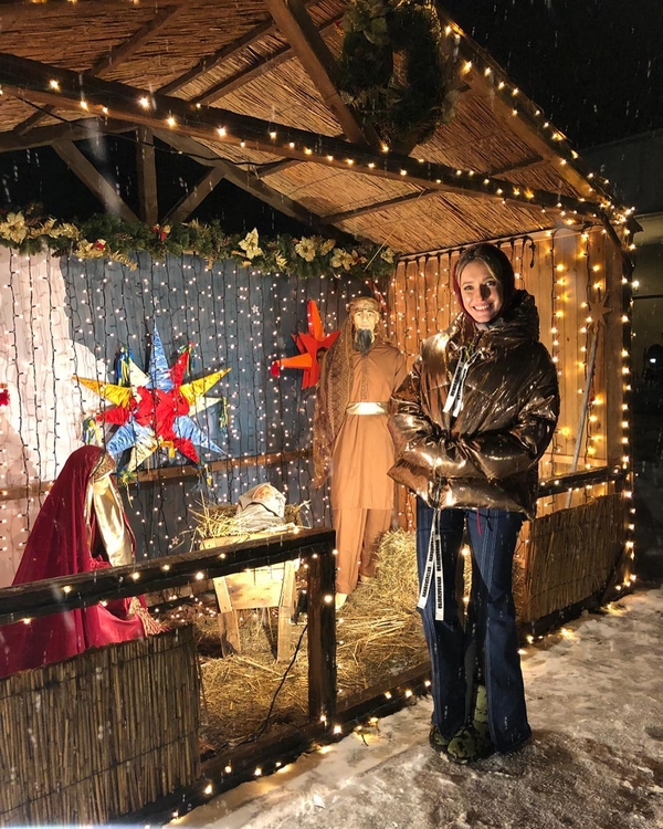 Она сфотографировалась возле праздничной “шопки“ - вертепа с младенцем Иисусом.